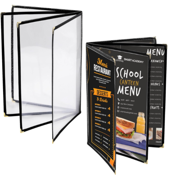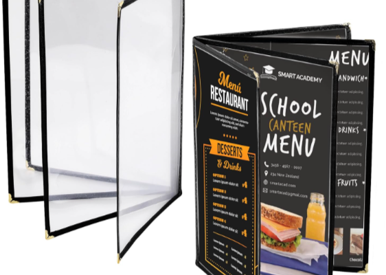Quick-service establishments benefit from wipeable materials and simple, bold designs that communicate efficiently in fast-paced environments. Laminated options or vinyl covers work well for menus that need frequent updating or heavy use.